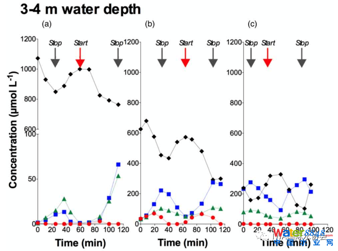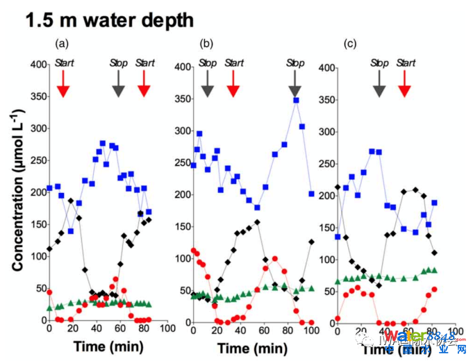 他們也想通過研究發(fā)現(xiàn)主流的厭氧氨氧化或反硝化作用是否會跟短程生物脫氮 (SBNR)相結(jié)合,例如DEMON工藝中的硝化-厭氧氨氧化反應(yīng)。所以他們也就主流的DO、氨氮、硝態(tài)氮和亞硝態(tài)氮進行原位測量,分析氮轉(zhuǎn)化的情況。