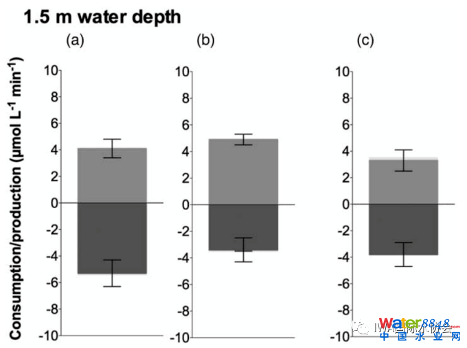 圖5. 硝化/反硝化池不同深度的氨氮凈消耗速率和硝態(tài)氮和亞硝態(tài)氮的生成速率情況。a/b/c分別指靠近、位于和遠離曝氣區(qū)的情況