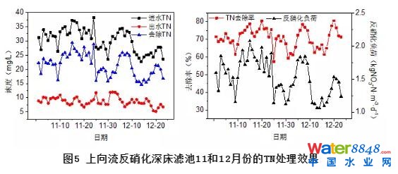 ①基于該提標(biāo)改造工程,經(jīng)上向流反硝化深床濾池深度處理后,污水處理廠出水能夠穩(wěn)定達(dá)到COD≤30 mg/L,BOD5≤6 mg/L,TN≤12 mg/L,SS≤5 mg/L,TP≤0.3 mg/L,且最大的TN去除量高達(dá)29.4 mg/L,相應(yīng)的反硝化負(fù)荷達(dá)到了2.08 kgNO3-N/(m3·d)。同時(shí),在進(jìn)水TN為10~20mg/L之間,其出水總氮可低至5 mg/L以下。