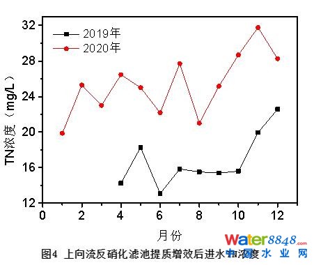 隨著三部委印發(fā)《城鎮(zhèn)污水處理提質(zhì)增效三年行動(dòng)方案(2019-2021年)》,2020年廣東省某水質(zhì)凈化廠(一期)污水管網(wǎng)修復(fù)、雨污分流的逐步完善,污水廠進(jìn)水水質(zhì)濃度提高,提質(zhì)增效后上向流反硝化濾池進(jìn)水總氮較2019年明顯升高,結(jié)果可見圖4。