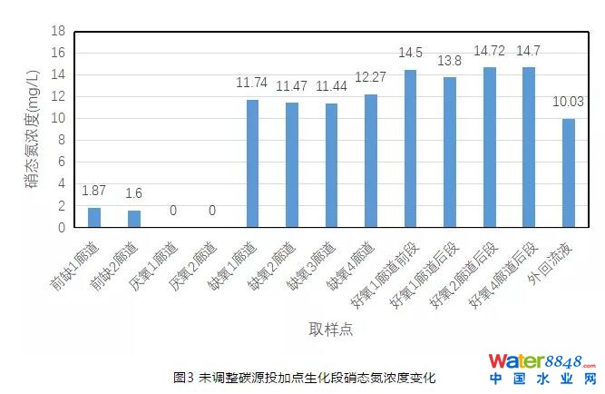 該廠在之前的調(diào)試運(yùn)行期間,曾在缺氧池4廊道投加碳源,但硝態(tài)氮的去除效果并不明顯,原因是缺氧池4廊道為內(nèi)回流廊道,DO為0.5 mg/L,內(nèi)回流液攜帶的溶解氧會(huì)消耗優(yōu)質(zhì)碳源,為避免外加碳源的無(wú)效消耗,將碳源投加位點(diǎn)改為缺氧池1廊道,DO為0.11 mg/L,并進(jìn)行沿程氮組分分析。