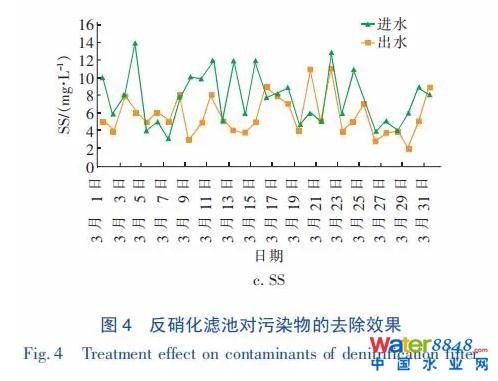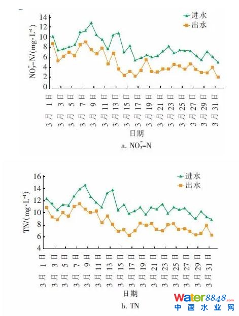 經(jīng)連續(xù)運行,系統(tǒng)整體、各子系統(tǒng)和設(shè)備運行正常,穩(wěn)定可靠。主要監(jiān)測項目有進、出水的 COD、SS、 TP、TN、NH3 - N、NO-3 - N、NO-2 - N 等,出水水質(zhì)穩(wěn)定達到且優(yōu)于一級 A 標準。2018 年 3 月主要水質(zhì)指標變化如圖 4 所示。