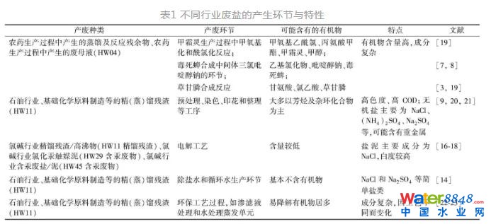研究背景:工業(yè)廢鹽(以下簡(jiǎn)稱“廢鹽”)主要產(chǎn)生于農(nóng)藥中間體、藥物合成和印染等工業(yè)生產(chǎn)過(guò)程以及固液分離、溶液濃縮結(jié)晶及污水處理等過(guò)程,具有種類繁多、成分復(fù)雜、來(lái)源眾多、處理成本高、環(huán)境危害大等特點(diǎn)。2016年,《國(guó)家危險(xiǎn)廢物名錄》把多種生產(chǎn)過(guò)程中的蒸餾和反應(yīng)殘余物、廢母液與反應(yīng)罐及容器清洗廢液等廢棄物正式列入危險(xiǎn)廢物名錄。近年來(lái),我國(guó)廢鹽產(chǎn)生量不斷增加,預(yù)計(jì)年產(chǎn)生量超過(guò)500萬(wàn)t,其中農(nóng)藥占30%,精細(xì)化工占15%,醫(yī)藥占10%,其他占45%。目前,廢鹽普遍實(shí)行企業(yè)建庫(kù)集中暫存的方式進(jìn)行處理,但如何對(duì)其進(jìn)行徹底的無(wú)害化資源化處理與處置已成為一個(gè)亟待解決的現(xiàn)實(shí)問(wèn)題,得到社會(huì)各界的廣泛關(guān)注。 現(xiàn)有廢鹽的末端處理技術(shù)主要為填埋、焚燒和無(wú)害化綜合利用。填埋是將廢鹽經(jīng)過(guò)混凝土等固化后,按照填埋技術(shù)規(guī)范送入剛性填埋場(chǎng)進(jìn)行衛(wèi)生填埋處置。焚燒是將廢鹽加熱到900 ℃,無(wú)機(jī)鹽熔融流入爐底,經(jīng)冷卻后回收,有機(jī)物在高溫下?lián)]發(fā)和分解。由于廢鹽熔點(diǎn)區(qū)間波動(dòng)大,在焚燒處理過(guò)程中極易發(fā)生結(jié)渣、結(jié)塊等不利現(xiàn)象,影響工藝穩(wěn)定性。一些臨海國(guó)家采取廢鹽無(wú)害化處理后傾倒入海洋,但在我國(guó)大部分地區(qū)不具備實(shí)施條件。在此背景下,廢鹽的無(wú)害化資源化綜合利用成為廢鹽的必然出路,而制約其資源化大規(guī)模發(fā)展的因素主要為廢鹽中有機(jī)物的去除。目前,國(guó)內(nèi)外對(duì)廢鹽的相關(guān)研究較少,本文通過(guò)闡述廢鹽的產(chǎn)生現(xiàn)狀和分析廢鹽中有機(jī)物的去除技術(shù),進(jìn)而提出對(duì)廢鹽處理設(shè)施建設(shè)和末端產(chǎn)品管理的建議,為未來(lái)相關(guān)行業(yè)發(fā)展提供參考。 摘 要 工業(yè)廢鹽的資源化逐漸成為其處理處置的發(fā)展趨勢(shì),而廢鹽中有機(jī)物的去除是實(shí)現(xiàn)這一目標(biāo)的關(guān)鍵點(diǎn)和難點(diǎn)。介紹了我國(guó)工業(yè)廢鹽中有機(jī)物的產(chǎn)生環(huán)節(jié)及其特點(diǎn),針對(duì)含機(jī)物的工業(yè)廢鹽的處理處置需求,總結(jié)了熱解碳化、高溫熔融和氧化法3種有機(jī)物去除方式,并比較了各工藝路線的適用條件和應(yīng)用現(xiàn)狀,同時(shí)研究了工業(yè)廢鹽資源化產(chǎn)品的出路和相關(guān)標(biāo)準(zhǔn)規(guī)范,提出了“源頭節(jié)流—完善標(biāo)準(zhǔn)—行業(yè)監(jiān)管—鼓勵(lì)創(chuàng)新”的廢鹽管理建議。 01 工業(yè)廢鹽中的有機(jī)物現(xiàn)狀 1.廢鹽產(chǎn)生現(xiàn)狀分析 我國(guó)涉及廢鹽產(chǎn)生的行業(yè)眾多,如農(nóng)藥合成行業(yè)、氯堿工業(yè)、煤化工行業(yè)和環(huán)保行業(yè)。產(chǎn)生的廢鹽種類包括單一廢鹽、混鹽和雜鹽(含雜質(zhì)),工藝的特殊性和生產(chǎn)環(huán)節(jié)的差異導(dǎo)致不同行業(yè)產(chǎn)生的廢鹽有較大差別,主要類型的特點(diǎn)如表1所示。