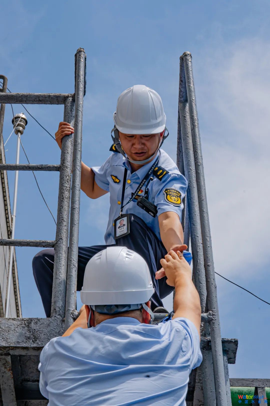 圖為執(zhí)法人員接力爬上高空平臺。秦蒸攝