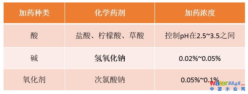 化學(xué)清洗包括維護(hù)清洗和強(qiáng)力(恢復(fù))清洗。目前常用的清洗劑有NaClO溶液,用于去除有機(jī)污染物,檸檬酸,用于去除無(wú)機(jī)污染物等。