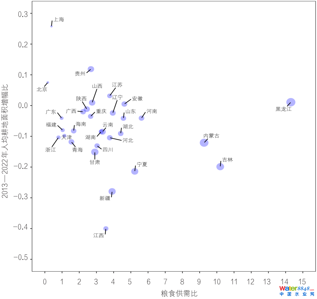 ▲30個統(tǒng)計省份耕地與糧食供需關系(圓形大小代表2022年人均耕地面積多少)