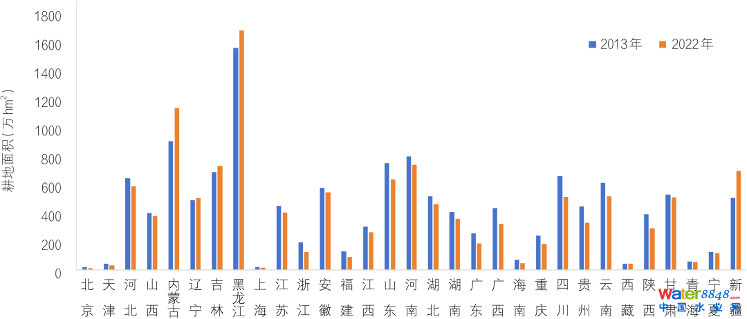 在全球氣候變化的背景下,極端天氣事件的頻發(fā)與地緣政治沖突的升級,對糧食生產、貿易等環(huán)節(jié)構成了嚴峻威脅,嚴重影響我國糧食安全的穩(wěn)定性。一是國際市場糧食可獲得性顯著下降。自烏克蘭危機暴發(fā)以來,俄羅斯、烏克蘭、阿根廷、哈薩克斯坦等多個糧食主產國相繼實施了糧食出口限制措施。雖然我國糧食生產實現(xiàn)了“二十連豐”,2023年糧食播種面積達到17.85億畝,總產量達到6.95億t,但當前糧食生產體系下的生產能力已經(jīng)達到階段性的峰值,國際市場的不確定性仍是威脅我國糧食安全不可忽視的外部因素。二是國內耕地資源面臨縮減壓力,根據(jù)2021年國務院公布的第三次全國國土調查主要數(shù)據(jù),我國耕地面積已降至1.28億hm²,與第二次全國國土調查數(shù)據(jù)相比減少了0.07億hm²,這一趨勢不僅限制了糧食生產的潛力,也影響糧食自給率的提升。2013年與2022年31省份耕地面積對比見下圖。三是糧食產銷區(qū)域的不平衡問題越發(fā)凸顯。我國13個糧食主產區(qū)中,僅6個省份能夠實現(xiàn)糧食凈調出。原本保持產銷平衡的11個省份,已有9個省份的糧食自給率降至60%以下,7個糧食主銷區(qū)省份自給率不足25%,多重風險疊加對我國糧食安全產生沖擊。開發(fā)北方地區(qū)后備耕地,提高我國糧食安全保障水平的需求日益迫切。