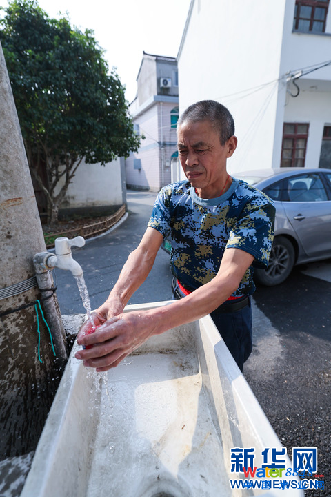 10月11日,道場(chǎng)鄉(xiāng)道場(chǎng)浜村的村民用自來水洗水果,用過的水將進(jìn)入農(nóng)村生活污水處理終端進(jìn)行處理。新華社記者 徐昱 攝