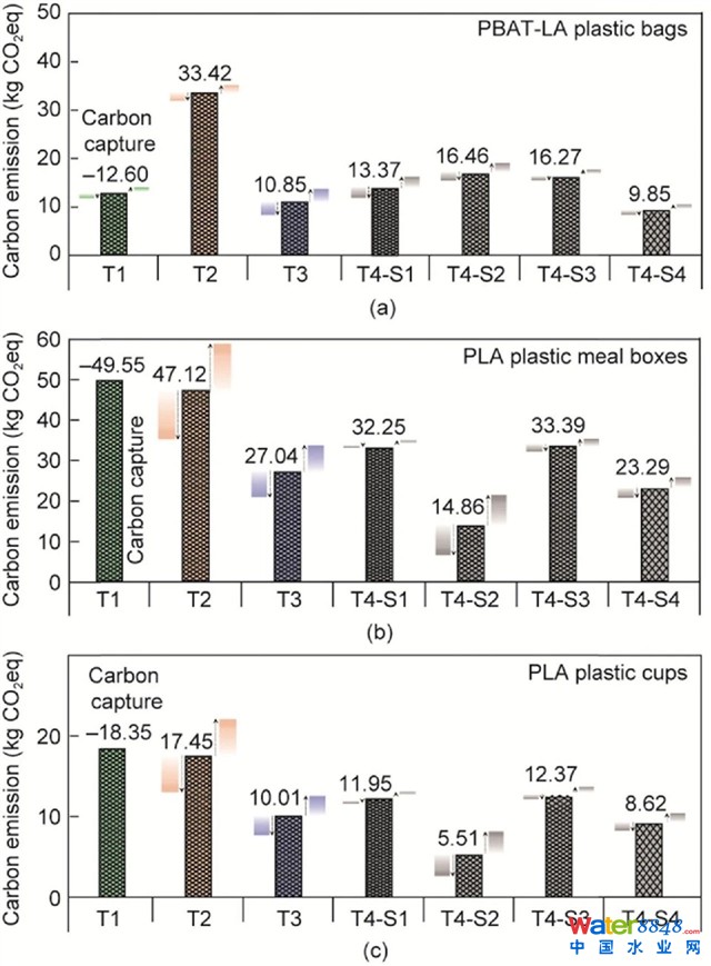 圖. 可生物降解塑料產(chǎn)品(BPPs)在整個(gè)生命周期中的碳排放。(a - c)(a)1000 個(gè)一次性 PBAT - LA 塑料袋的碳排放;(b)1000 個(gè)一次性 PLA 塑料餐盒的碳排放;以及(c)1000 個(gè)一次性 PLA 塑料杯的碳排放。在此,標(biāo)簽 T4 - S1、T4 - S2、T4 - S3 和 T4 - S4 表示 T4 階段分別使用 S1、S2、S3 或 S4 方案。