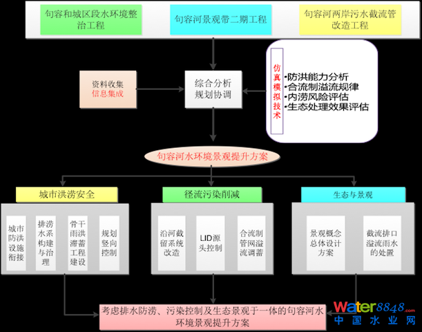 本項(xiàng)目涉及流域洪澇及城市雨污水宏觀系統(tǒng),河流生態(tài)景觀局部細(xì)節(jié)和系統(tǒng)協(xié)調(diào)與優(yōu)化決策三個(gè)層面。技術(shù)路線見下圖: