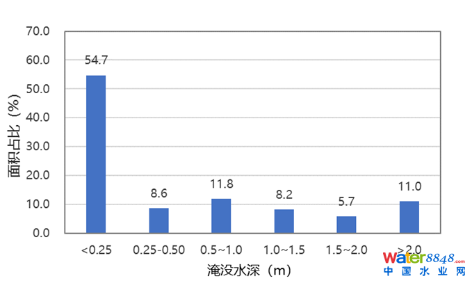 進(jìn)一步統(tǒng)計(jì)淹沒(méi)水深面積占比,最大積水深度超過(guò) 0.25m的面積為 479.1 km2,占總面積的 45.3%,其中,0.5~2m的面積為272.4 km2,占比25.8%;2m以上的面積達(dá)到116.0 km2。