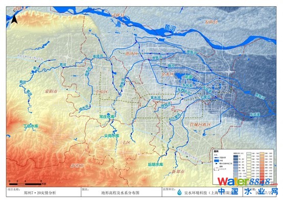 7·20暴雨中心由西南山區(qū)逐漸向東北鄭州市區(qū)發(fā)展,導(dǎo)致城市河道由于山區(qū)暴雨徑流和水庫(kù)安全下泄,水位快速抬升,在市區(qū)發(fā)生特大暴雨時(shí),城區(qū)河道排水條件不利。