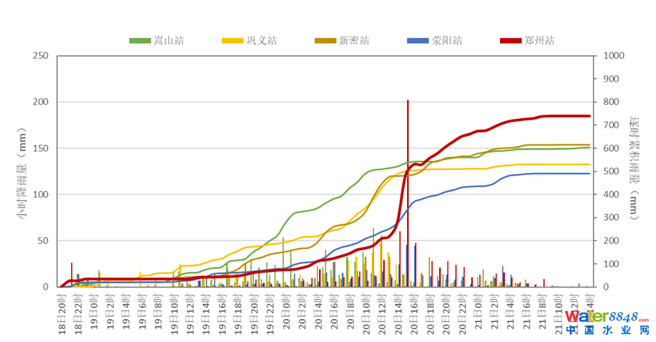 圖 4 鄭州市及西部國(guó)家雨量站7.20暴雨逐時(shí)和累積降雨量(制圖:宜水環(huán)境)
