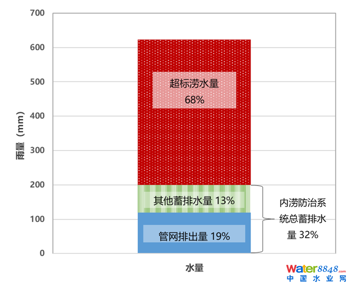 根據(jù)上述特征暴雨雨量分析,管網(wǎng)在設(shè)計(jì)能力條件下排水量(含海綿設(shè)施)占本次極端降雨總雨量的19%,50年一遇防澇系統(tǒng)排水量(含管網(wǎng))約占32%,超標(biāo)雨水占比達(dá)到68%,大量超出內(nèi)澇防治體系能力標(biāo)準(zhǔn)的雨水將形成快速的地表坡面匯流,流向地勢(shì)低洼區(qū)域。