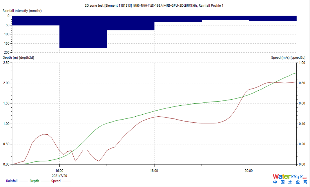 暴雨期間,鄭州市阜外華中心血管病醫(yī)院(簡(jiǎn)稱(chēng)阜外醫(yī)院)因暴雨積水,停水?dāng)嚯姟⒌缆肥苎、交通受阻,?dǎo)致近5000人被困。阜外醫(yī)院所在的城東中牟處于鄭州地勢(shì)最低處,賈魯河、魏河、龍湖等水體交匯處下游,暴雨后河水暴漲導(dǎo)致大量積水倒灌,導(dǎo)致路面水位上升速度快、漲幅高,但受地形影響退水速度較慢。通過(guò)模擬2021年7月20日15時(shí)~7月20日21時(shí)間鄭州站實(shí)際降雨,結(jié)果顯示阜外醫(yī)院周邊區(qū)域水位6小時(shí)水位上升可達(dá)到2.25m左右。
