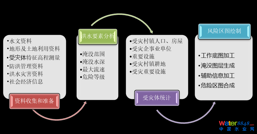 此文結(jié)合本公司在多個國內(nèi)外洪澇風(fēng)險評估項目中的實戰(zhàn)經(jīng)驗,凝練出洪水風(fēng)險區(qū)圖編制的通用流程,即四個步驟:基礎(chǔ)資料收集、洪水要素分析、受災(zāi)體統(tǒng)計以及風(fēng)險圖繪制。
