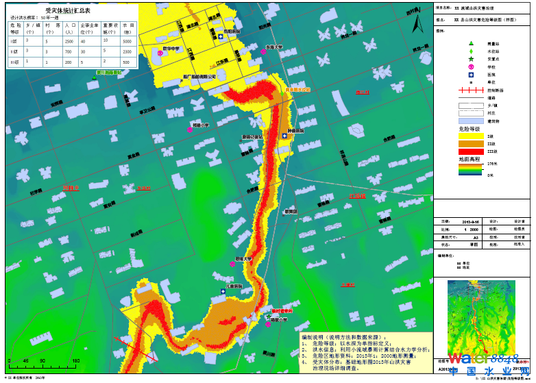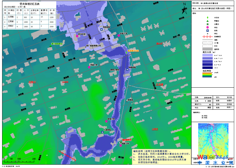 洪水要素圖(范圍水深圖)的樣圖在地理底圖層上,通過不同的顏色表示不同檔次的淹沒水深、并用用醒目的點表示可能的受災(zāi)體,并在圖幅內(nèi)列出受災(zāi)體匯總統(tǒng)計總表(如表2)、編制說明、圖名、圖例、比例尺、指北針及制圖質(zhì)量控制信息。