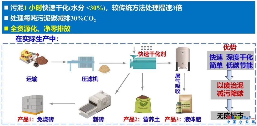 這種污泥干化“神器”是如何工作的呢?據(jù)團(tuán)隊負(fù)責(zé)人、東華大學(xué)環(huán)境科學(xué)與工程學(xué)院2022級博士生孔祥海介紹,干化劑按一定比例添加到污泥中可與水分和有機(jī)質(zhì)發(fā)生反應(yīng),并快速放熱,2分鐘使污泥快速升溫至100-125攝氏度,1小時將污泥含水量從70-80%降至20-30%,重量和體積減少30%以上,產(chǎn)物可用作混凝土填料或燃料。除了快速降低污泥的含水量,污泥干化技術(shù)還能有效鈍化污泥中的重金屬(有效態(tài)重金屬降低90%以上),消除污泥中的激素、抗生素、有害菌等污染物(三害消除95%以上),實現(xiàn)同步無害化,促進(jìn)金屬廢渣危廢和污泥處理產(chǎn)業(yè)集約化、智能化、裝備化和綠色化。此外,干化后的污泥還可以制備成免燒磚和營養(yǎng)土,干化過程中產(chǎn)生的尾氣吸收后可做液體肥,實現(xiàn)資源化利用。