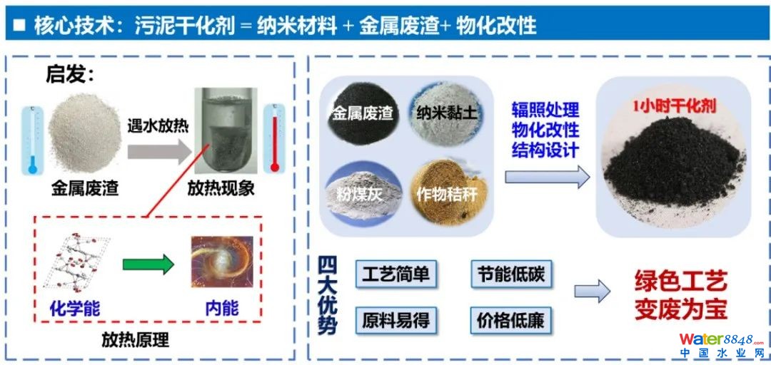針對污泥干化問題,東華大學(xué)學(xué)生團(tuán)隊以金屬廢渣危廢為基礎(chǔ)材料,巧妙利用其反應(yīng)性和成分組成,經(jīng)過結(jié)構(gòu)設(shè)計、物化改性和修飾賦能,通過干化劑的“熱驅(qū)動-骨架建立-胞外聚合物降解”協(xié)同作用機(jī)制,研發(fā)出1小時干化劑,為污泥脫水提供一種近零成本、高效、簡便、綠色的新路徑,助力解決市政污泥規(guī);幚硖幹煤唾Y源化利用“卡脖子”問題。
