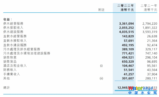 截止2022年12月31日,其營(yíng)業(yè)收入為129.50億港元(人民幣:111.23億元)同比上年的103.46億港元,增長(zhǎng)25.2%。其中,供水業(yè)務(wù)營(yíng)業(yè)收入87.14億元,占營(yíng)收比重為78.35%;污水處理業(yè)務(wù)營(yíng)業(yè)收入9.97億元,占營(yíng)收比重為8.96%;銷(xiāo)售物業(yè)業(yè)務(wù)營(yíng)業(yè)收入4.25億元,占營(yíng)收比重為3.82%。