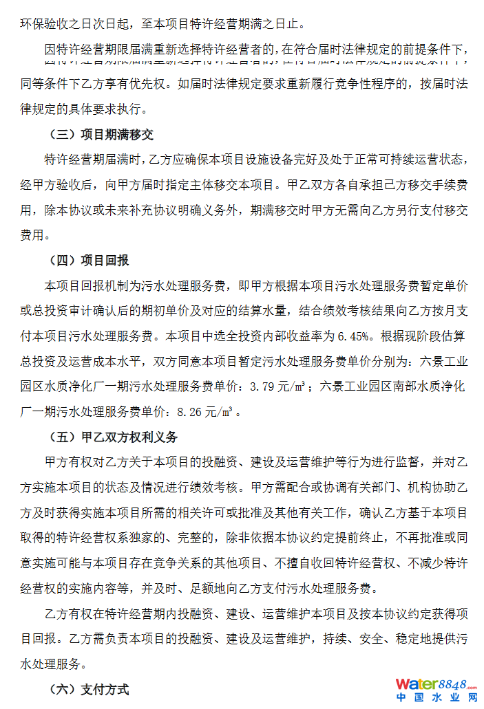 本項目回報機制為污水處理服務費,即甲方根據本項目污水處理服務費暫定單價或總投資審計確認后的期初單價及對應的結算水量,結合績效考核結果向乙方按月支付本項目污水處理服務費。本項目中選全投資內部收益率為6.45%。根據現階段估算總投資及運營成本水平,雙方同意本項目暫定污水處理服務費單價分別為:六景工業(yè)園區(qū)水質凈化廠一期污水處理服務費單價:3.79元/m³;六景工業(yè)園區(qū)南部水質凈化廠一期污水處理服務費單價:8.26元/m³。
