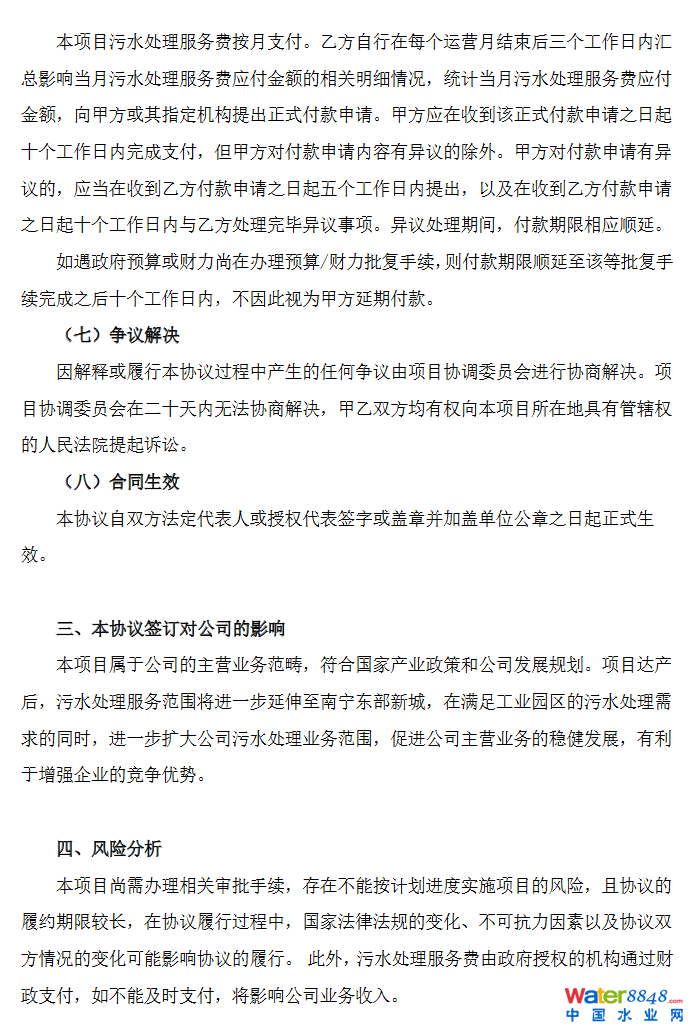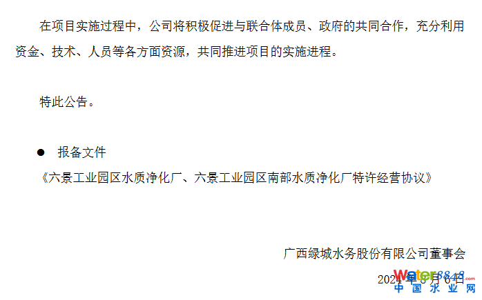 綠城水務:簽訂六景工業(yè)園區(qū)水質凈化廠、六景工業(yè)園區(qū)南部水質凈化廠特許經營協議