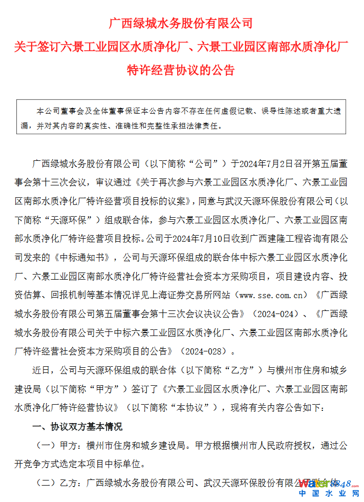 北極星水處理網獲悉,綠城水務公布,近日,公司與天源環(huán)保組成的聯合體(以下簡稱“乙方”)與橫州市住房和城鄉(xiāng)建設局(以下簡稱“甲方”)簽訂了《六景工業(yè)園區(qū)水質凈化廠、六景工業(yè)園區(qū)南部水質凈化廠特許經營協議》。