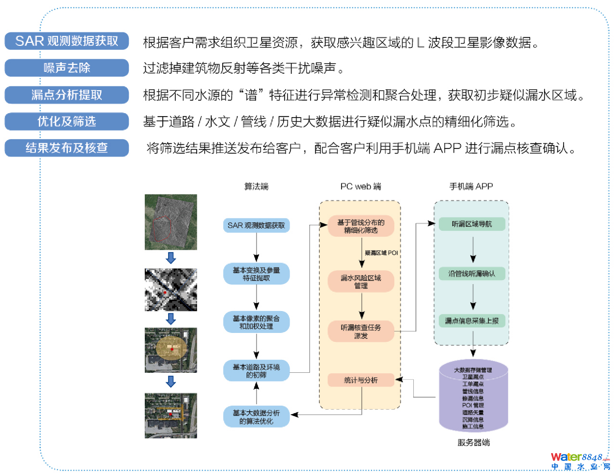 利用雷達(dá)的穿透性特點(diǎn),采用長波段雷達(dá)衛(wèi)星掃描獲取整個(gè)城市的雷達(dá)遙感數(shù)據(jù),通過濾波、特征變換等算法模型分析管線泄露導(dǎo)致的土壤含水量差異,檢測(cè)識(shí)別出小范圍的疑似漏水區(qū)域,為地面檢漏核查提供準(zhǔn)確依據(jù)。