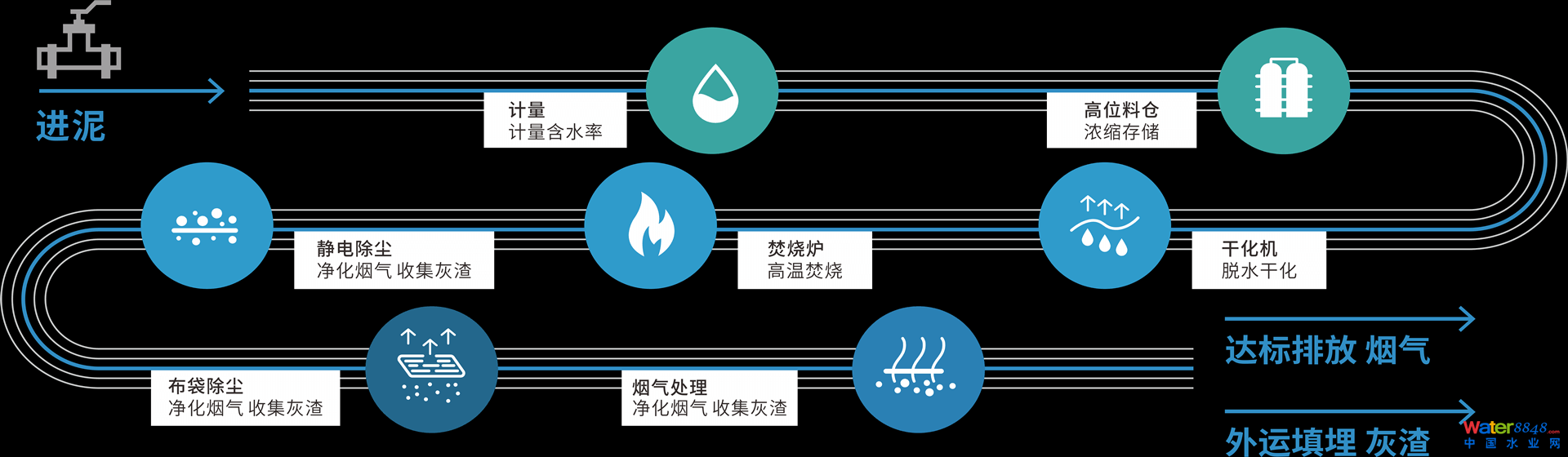 該廠主體工藝采用“半干化+焚燒”技術(shù)。是國內(nèi)首家采用該工藝的污泥焚燒廠,該工藝就地實現(xiàn)了污泥減量化、無害化和穩(wěn)定化處理。