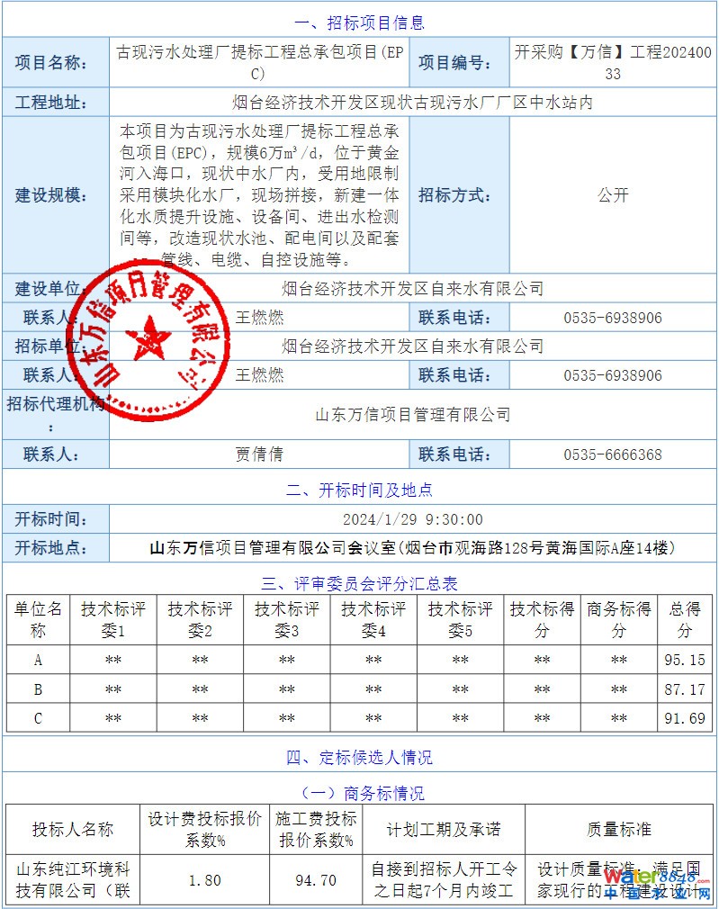 多家名企!煙臺(tái)古現(xiàn)污水處理廠(chǎng)提標(biāo)工程總承包項(xiàng)目(EPC)定標(biāo)候選人公示