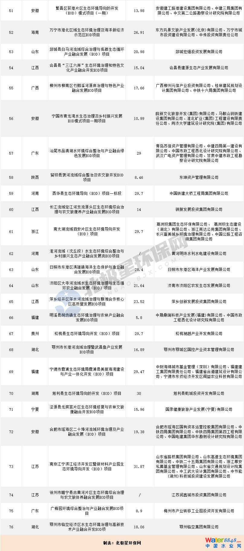 從項目金額看,76個中標(biāo)項目投資額集中在10-30億元,占比約60%。其中投資額最高的為河北省潮河流域(灤平段)生態(tài)治理與鄉(xiāng)村振興產(chǎn)業(yè)融合發(fā)展(EOD)及工業(yè)固廢綜合利用項目。該項目總投資1855031.7萬元,包括項目A、B兩部分內(nèi)容,其中項目A投資約1132173.45萬元;項目B投資約為722858.30萬元。