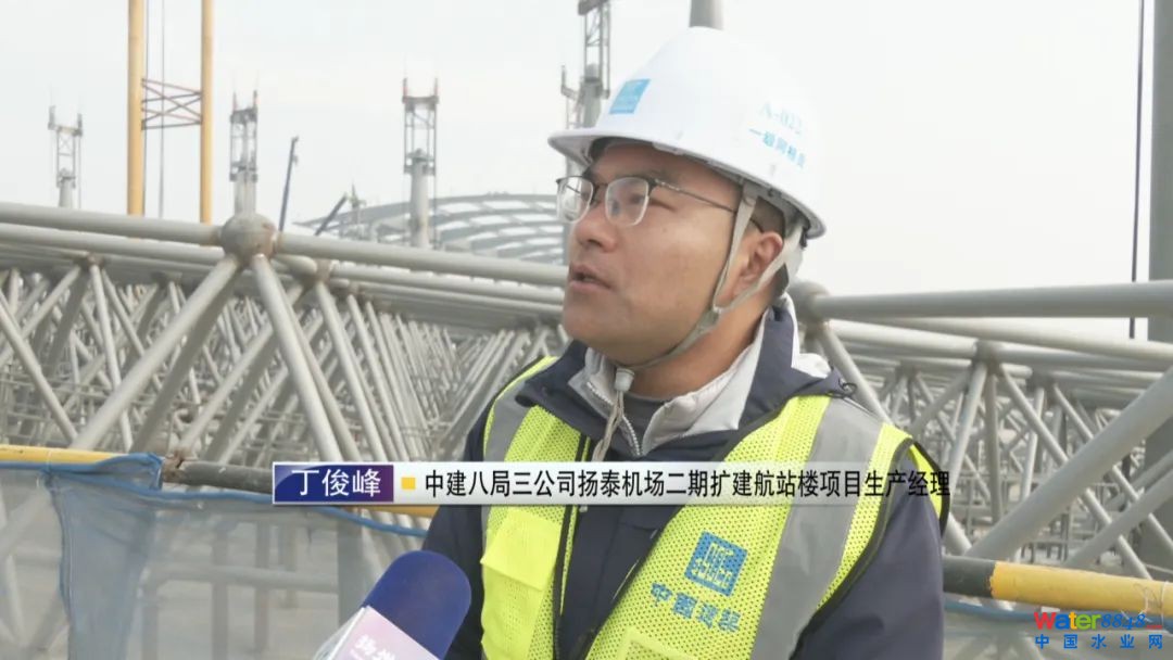 中建八局三公司揚(yáng)泰機(jī)場二期擴(kuò)建航站樓項(xiàng)目生產(chǎn)經(jīng)理 丁俊峰:預(yù)計(jì)到明年4月中下旬的時(shí)候,我們整個(gè)網(wǎng)架提升全部完成,整個(gè)機(jī)場航站樓形象給揚(yáng)州市民展現(xiàn)出來。
