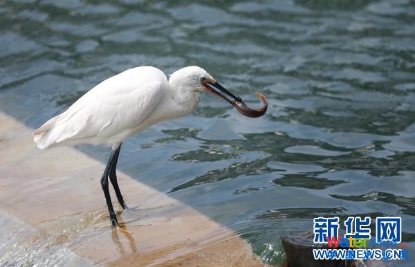 白鷺在南明河上捕食泥鰍。新華網(wǎng) 盧志佳 攝