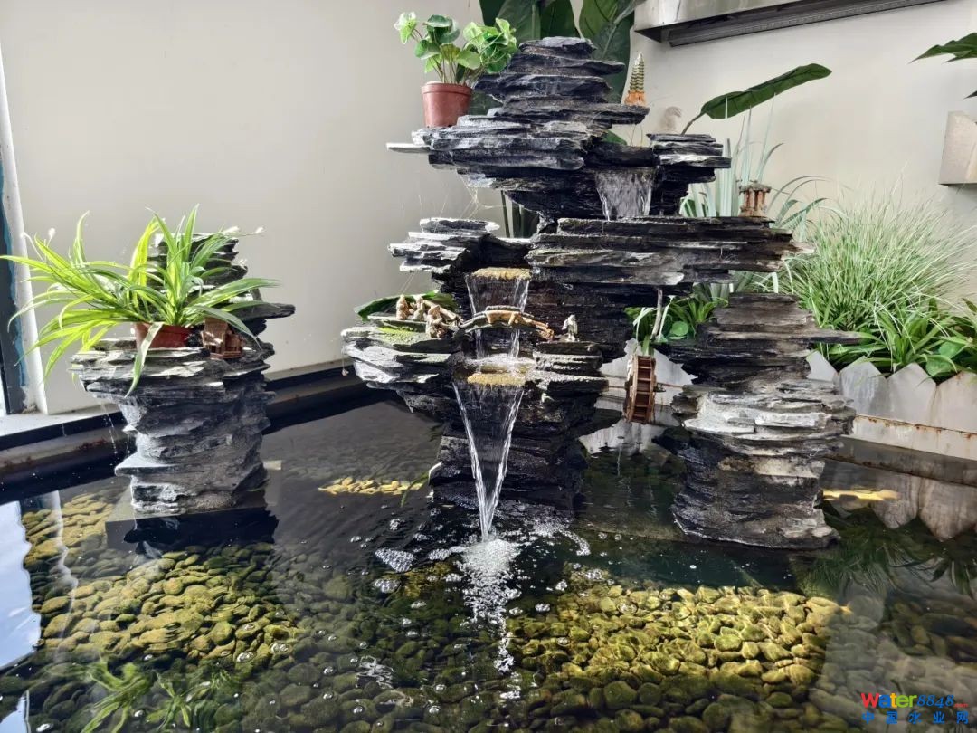 大廳里水景池流水潺潺,清澈的循環(huán)水、穿梭的錦鯉魚、秀麗的假山和迷你瀑布,處處洋溢著勃勃生機。這些水進廠的時候都是骯臟刺鼻的污水,經(jīng)過污水廠的凈化處理后成為無害化的水,在這個水景池中循環(huán)流淌,成為魚兒們生活的天堂。
