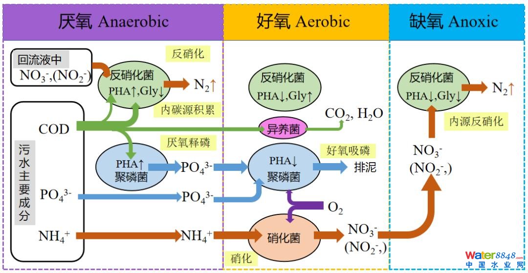 厭氧階段(An):在厭氧階段主要發(fā)生有機物(用COD或BOD表示)的去除、釋磷過程和反硝化過程。反硝化菌在厭氧階段吸收污水中的有機物,將其轉(zhuǎn)化為內(nèi)碳源貯存于細胞內(nèi)。同時反硝化菌利用原水中的有機物去除回流污泥中的硝態(tài)氮或亞硝態(tài)氮。此外,聚磷菌分解體內(nèi)的多聚磷酸鹽產(chǎn)生能量,并利用這部分能量吸收污水中的有機物,將其轉(zhuǎn)化為內(nèi)碳源,該過程伴隨著磷酸鹽的釋放。