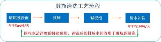 回收水潔凈度的降級使用。將玻璃瓶沖洗后的水進行回收,作為第一道臟瓶的浸泡水,同時達到節(jié)水和臟瓶預浸泡的目的。