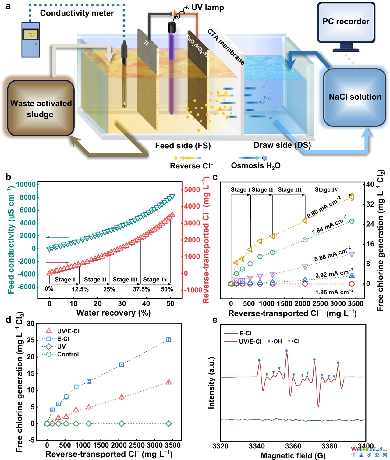 3月19日,大連理工大學(xué)環(huán)境學(xué)院張捍民教授在《自然》子刊《自然-通訊》(Nature Communications)上在線發(fā)表了題為“動(dòng)態(tài)反向擴(kuò)散氯離子驅(qū)動(dòng)一體化污泥調(diào)理和脫水”(Dynamic reverse Cl- driven integration of sludge conditioning and dewatering)的研究論文,提出了一種新型原位紫外/電氧化(UV/E-Cl)輔助正向滲透(FO)工藝,用于在活性污泥脫水過程中針對(duì)性控制凝膠狀膜污染。