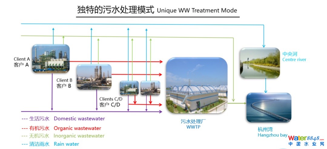 上;瘜W(xué)工業(yè)區(qū)發(fā)展有限公司下屬的上;瘜W(xué)工業(yè)區(qū)中法水務(wù)發(fā)展有限公司為園區(qū)內(nèi)企業(yè)提供一體化污水處理和排水管理服務(wù)。該模式與傳統(tǒng)分散式污水處理模式相比,在確保對(duì)各類污染物高效去除的前提下,節(jié)約了能耗、藥耗,以及碳排放,并在生態(tài)濕地凈化、綠色能源使用、廢轉(zhuǎn)能利用、減污降碳數(shù)字化平臺(tái)方面也進(jìn)行了探索嘗試。