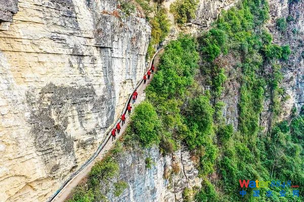 生機鎮(zhèn)是典型的喀斯特地貌區(qū),受特殊地理氣候條件影響,群眾生產(chǎn)生活用水十分困難。20世紀50年代至70年代,生機人手持鋼釬鏨子,掛在百米高的絕壁上,硬生生地鑿出10條總長130多公里的絕壁天渠。如今,絕壁天渠依然發(fā)揮著生活用水、生產(chǎn)灌溉作用。