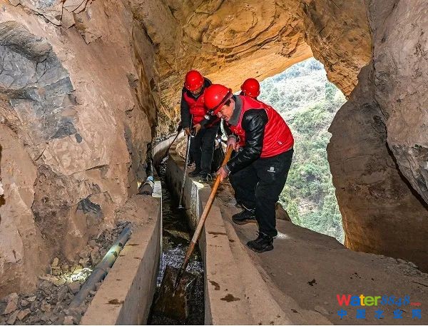 走過崖壁,記者和隊員們進到一處隧洞內(nèi)。洞里沒有燈,安靜得可以聽到流水聲。“洞里濕滑,大家一定小心!”隊員們點亮頭燈和手電筒,幾道光束在黑暗中交織。他們仔細清理著渠道,將渠系打掃得干干凈凈。走出隧洞,重見天日,豁然開朗,記者仿佛跨越時空,不禁對當年的鑿渠人和眼前的護渠人肅然起敬。