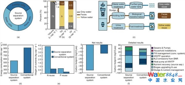 DWS 的建設(shè)為污水源頭分離奠定了基礎(chǔ)。源分離需要多領(lǐng)域與部門配合,可促進(jìn)能源回收、水處理及廢物利用等領(lǐng)域合作。通過(guò)分析灰水、黃水以及糞便的體積、總氮(TN)和總磷(TP)分布,能發(fā)現(xiàn)源分離具有極大的資源回收潛力;宜倮每尚纬稍偕,黃水與糞便回收可用于肥料生產(chǎn)。相較于傳統(tǒng)集中式水系統(tǒng),源分離簡(jiǎn)化了水質(zhì)復(fù)雜性,降低了后續(xù)水處理的能耗和碳排放,同時(shí)促進(jìn)了水中氮、磷資源的回收。