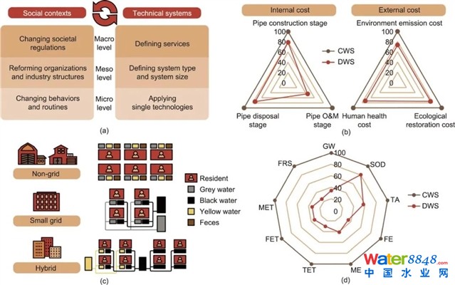 分散式水系統(tǒng)(DWS)是實(shí)現(xiàn)可持續(xù)城市供水系統(tǒng)的基礎(chǔ)。與傳統(tǒng)集中式系統(tǒng)相比,DWS 由無(wú)傳統(tǒng)地下管網(wǎng)(家庭或農(nóng)村地區(qū))、小型地下管網(wǎng)(街區(qū))和混合地下管網(wǎng)(大型社區(qū))組成。研究從社會(huì)環(huán)境、技術(shù)、成本、實(shí)施策略與環(huán)境影響多個(gè)方面對(duì)其進(jìn)行了探討。社會(huì)環(huán)境方面,制度框架、治理結(jié)構(gòu)以及個(gè)人習(xí)慣等因素決定著能否獲得各方正向反饋;技術(shù)層面需考慮水系統(tǒng)技術(shù)目標(biāo)、空間結(jié)構(gòu)與管控方式等;成本上,DWS 的內(nèi)部成本(管道建設(shè)、處置和運(yùn)行維護(hù)等直接經(jīng)濟(jì)支出)和外部成本(環(huán)境排放、人體健康和生態(tài)修復(fù)等間接影響)相較于集中式水系統(tǒng)(CWS)更低;實(shí)施策略上,考慮到管理難度、用戶接受度、技術(shù)選擇和重置成本,無(wú)管網(wǎng)和小規(guī)模管網(wǎng)系統(tǒng)因技術(shù)鎖定效應(yīng)更適合建設(shè) DWS;環(huán)境影響方面,DWS 的平均環(huán)境影響比 CWS 低 56%,在化石資源類別中,DWS 的環(huán)境影響僅為 CWS 的 25.2% ,顯示出其在減少有機(jī)物排放和節(jié)約能源方面的優(yōu)勢(shì)。