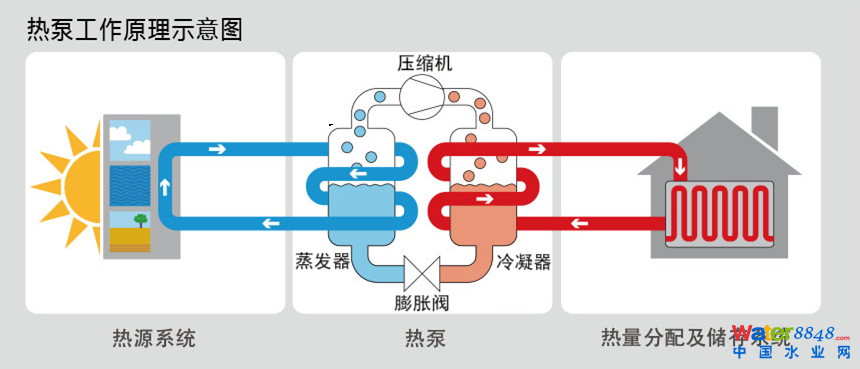 熱泵是將電力高效轉(zhuǎn)為熱量的最佳途徑,通過消耗少量電力將低品位熱能轉(zhuǎn)化為高品位熱能,可有效解決生產(chǎn)生活用熱需求,提高能源利用效率。熱泵機(jī)組的主要組成部件有壓縮機(jī)、冷凝器、蒸發(fā)器、節(jié)流閥等,其基本原理是逆卡諾循環(huán),熱泵系統(tǒng)通過閥和泵的控制,使冷媒在循環(huán)回路中被連續(xù)地壓縮和膨脹,將熱量從低溫環(huán)境中“抽取”并傳送到高溫環(huán)境中。