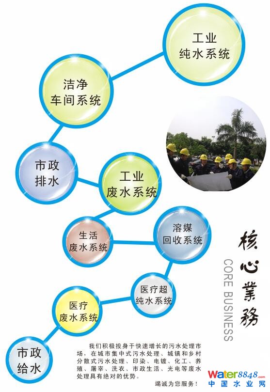 目前 ,公司主營業(yè)務(wù)含水務(wù)投 資建設(shè)運營 、PPP 、BT 、BOT 、EP C 、城市供水 、排水 、一 體化污水成套裝備制造 、工業(yè)園區(qū)污水處理 、河道 、湖泊 、水體治理 、土壤修復(fù) 、礦山治理、 農(nóng)田復(fù)墾 。依托節(jié)能環(huán)保綜合服務(wù) ,包括設(shè)計與規(guī)劃咨詢 、建造與工程總承包 、產(chǎn)融結(jié)合,打造節(jié)能環(huán)保 “ 全產(chǎn)業(yè)鏈 ”,為客戶提供整體解決方案和系統(tǒng)化服務(wù) ,成為節(jié)能環(huán)保領(lǐng)域具有競爭力的科技型服務(wù)型產(chǎn)業(yè)公司。