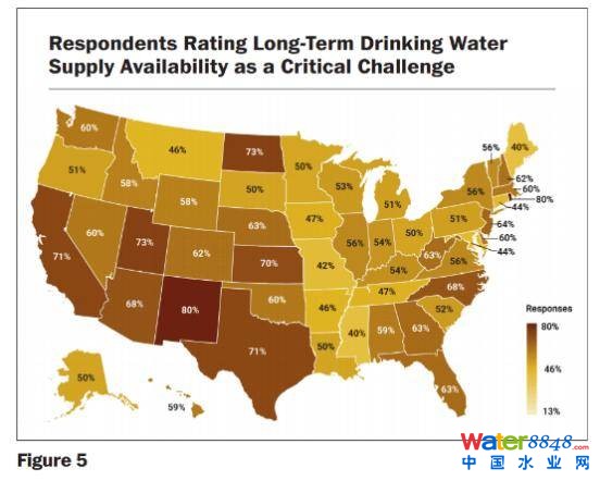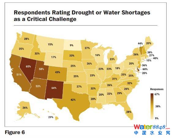 受訪者將長期穩(wěn)定的飲用水供應(yīng)列為排名第二的挑戰(zhàn)。調(diào)查結(jié)果來看,57%的受訪者認(rèn)為這一點(diǎn)至關(guān)重要。下圖(左)顯示了美國各州的響應(yīng)情況,30%的受訪者認(rèn)為干旱氣候或周期性水資源短缺的影響是至關(guān)重要。下圖(右)也按州表示了這些響應(yīng),顯示這些關(guān)注點(diǎn)主要集中在西南部的州。雖然短缺和干旱主要是一個(gè)區(qū)域性問題,但能夠?qū)崿F(xiàn)長期穩(wěn)定的供應(yīng)是整個(gè)美國普遍關(guān)注的問題。