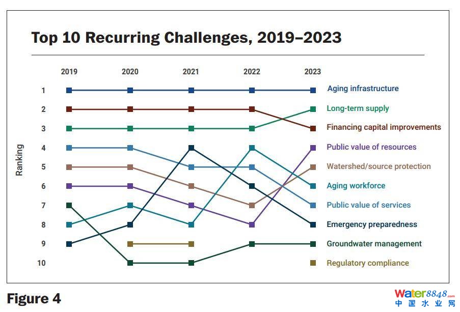 在2023年的調(diào)查中,受訪者被要求對20個(gè)水行業(yè)挑戰(zhàn)的嚴(yán)重性進(jìn)行評級。盡管在過去二十年中,影響水務(wù)行業(yè)的外部和內(nèi)部因素不斷發(fā)生變化,有時(shí)甚至是根本性的變化,但2023年調(diào)查確定的首要問題與前幾年基本保持一致:商業(yè)或財(cái)務(wù)考慮、基礎(chǔ)設(shè)施、監(jiān)管和水源(上圖)。下圖顯示,自2019年以來,老化基礎(chǔ)設(shè)施的修復(fù)/更換、資本改善融資和長期穩(wěn)定的飲用水供應(yīng)維持了前三大挑戰(zhàn)的地位。自2019年以來,其余7個(gè)優(yōu)先事項(xiàng)一直在波動,盡管每個(gè)優(yōu)先事項(xiàng)的平均排名差異很小。