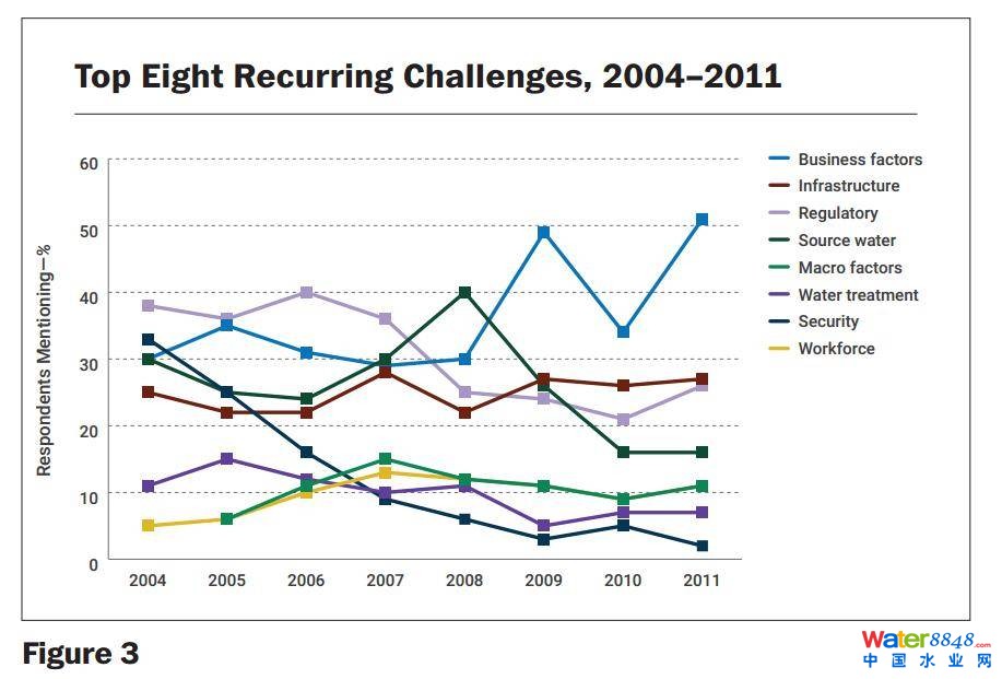 每年,AWWA都會要求受訪者對水行業(yè)面臨的挑戰(zhàn)的重要性進(jìn)行排名。最近的調(diào)查要求受訪者對他們認(rèn)為的每個(gè)挑戰(zhàn)進(jìn)行重要性排序,從不重要到極其重要。