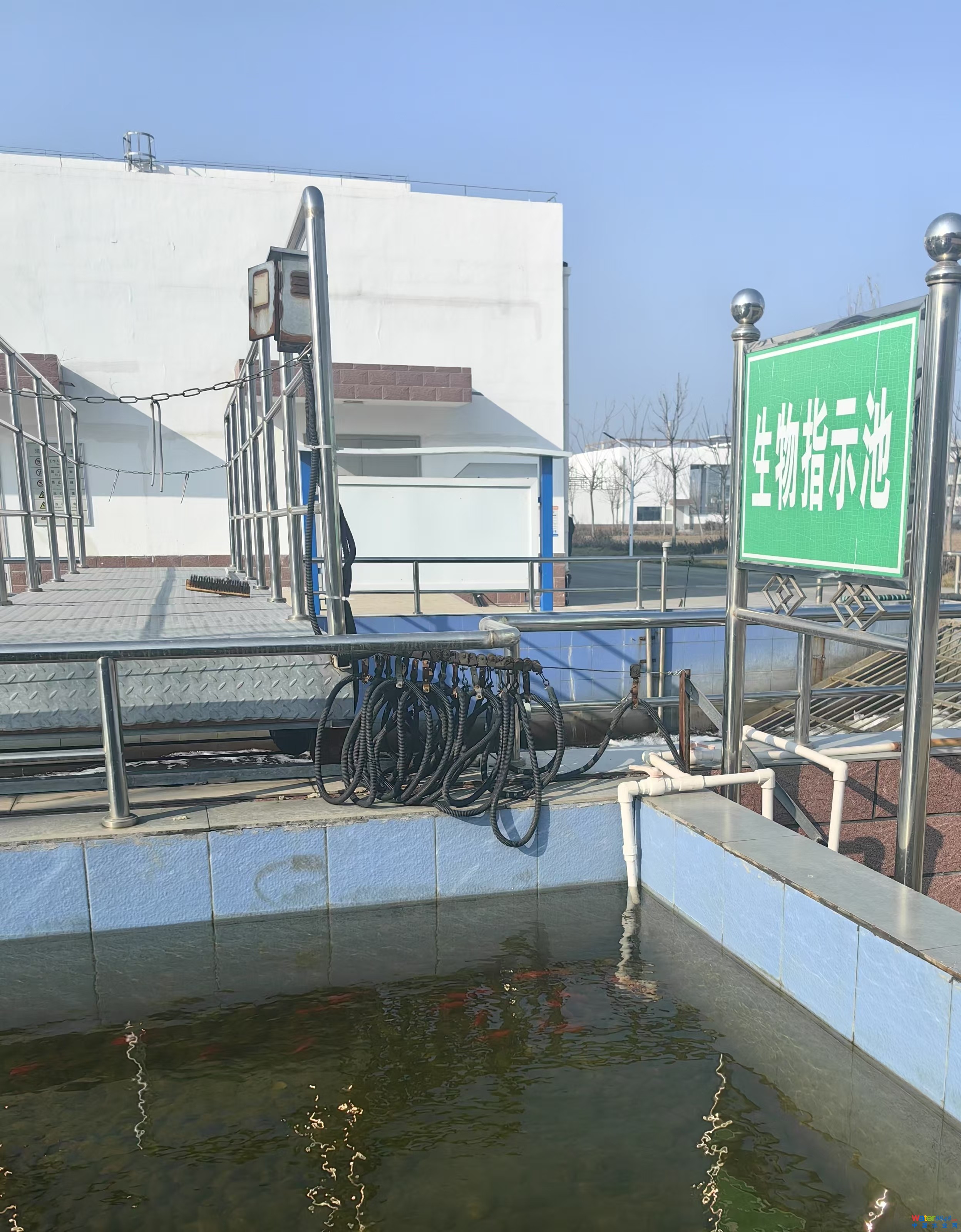 在德州市新生水廠排放口,處理后清澈的中水正“嘩嘩”地流向不遠處的岔河,旁邊生物指示池里,數十條紅色的金魚正游來游去。