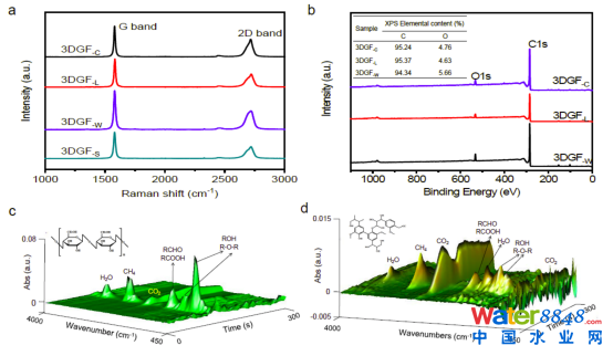 c (纖維素)和d (木質(zhì)素),模型生物質(zhì)熱解氣相產(chǎn)物的3D TGA-FTIR光譜。
