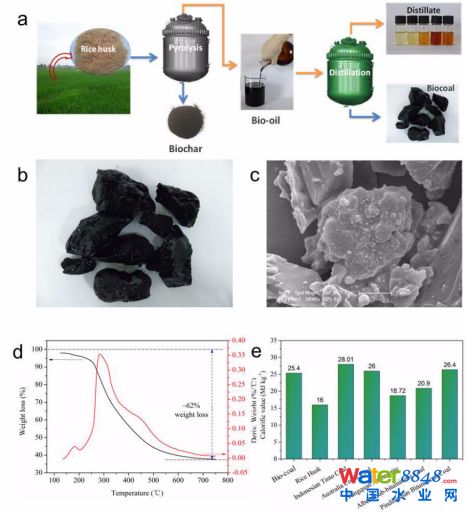d,生物煤的熱重分析。e,不同生物煤和部分商用煤的熱值比較。
